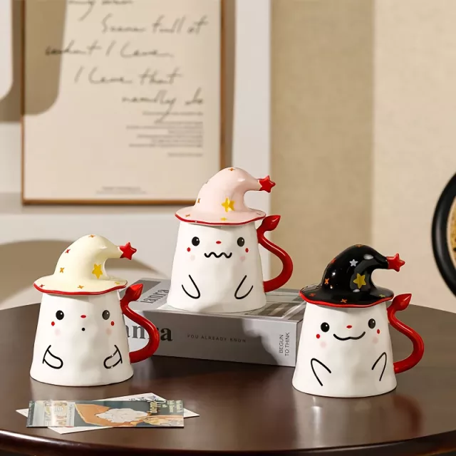 Halloween Ceramic Ghost Mug with Lid – Cute Ghost Magic Hat Coffee Cup